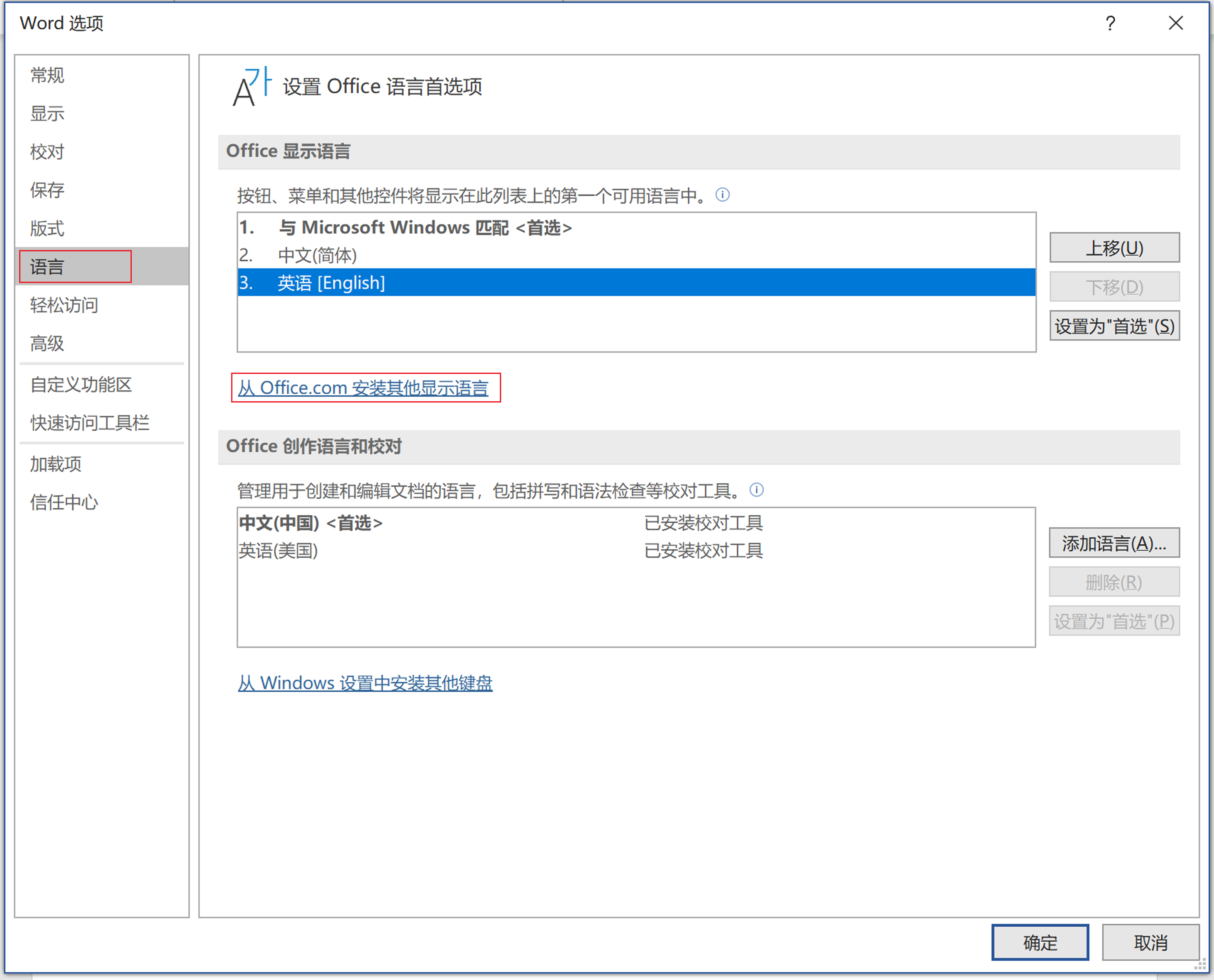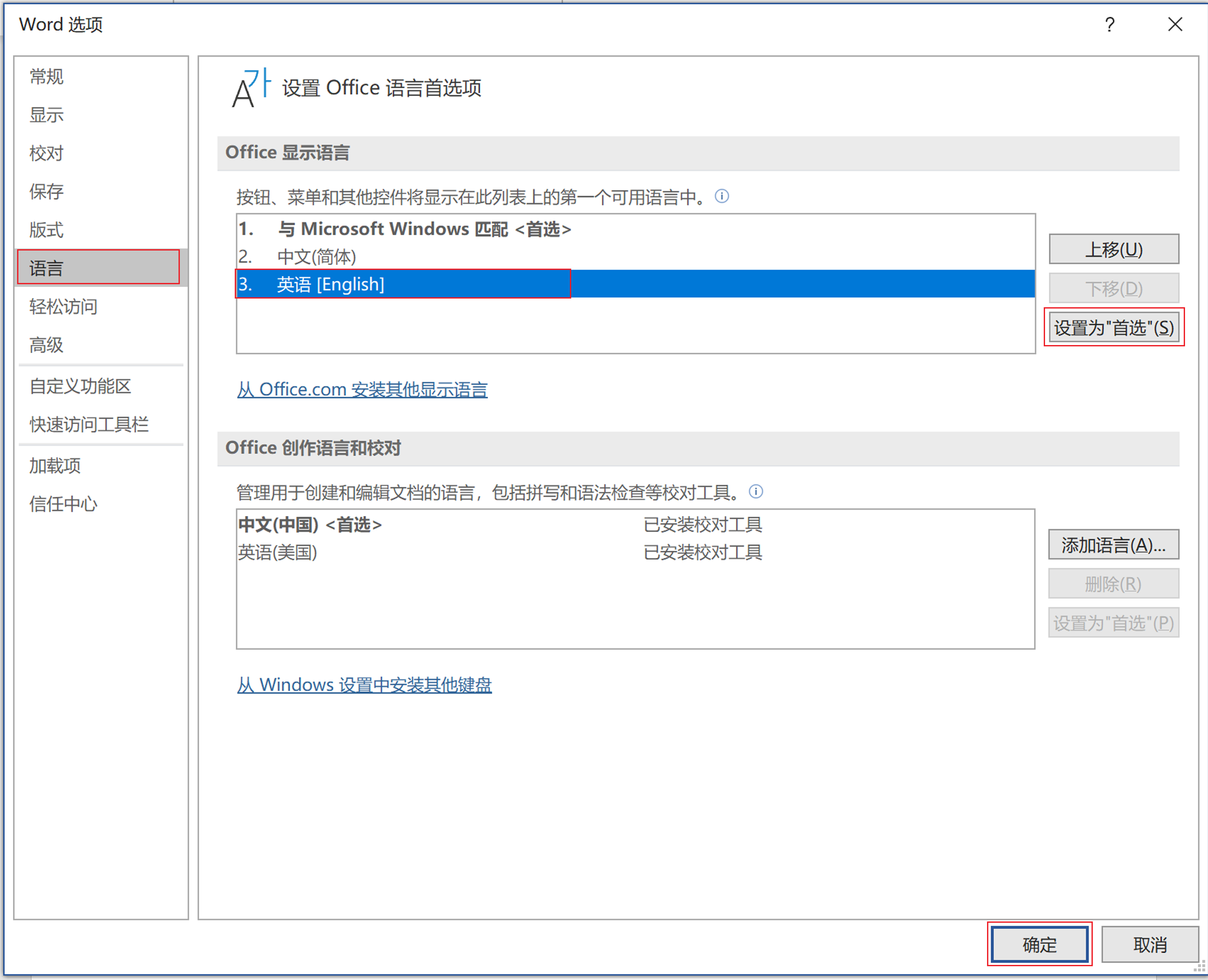 - 找到“语言”选项卡,可以设置 Office 语言首选项。在“Office 显示语言”中选中“英语[English]”,点击“设置为“首选” > 确定”。然后重启 Office 应用,查看语言是否已更换。