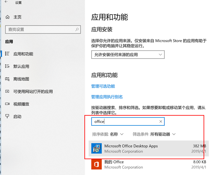 - 在应用搜索框中输入“Office”并搜索,卸载预装的 Office 软件。