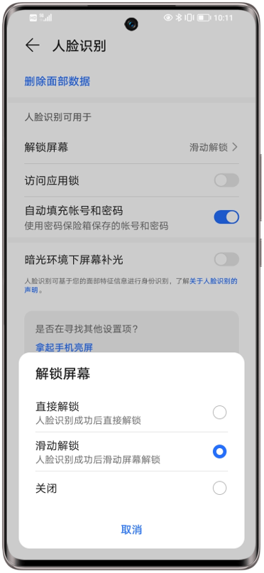 使用人脸解锁解锁功能时有两种解锁屏幕方式:直接解锁、滑动解锁。