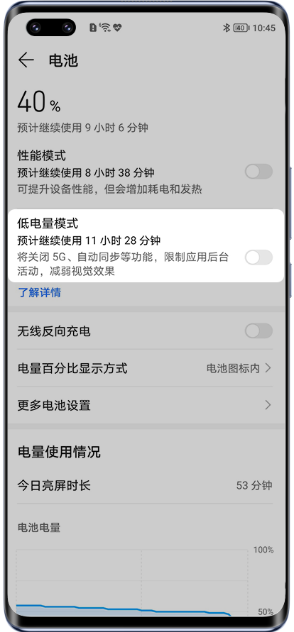 - 是否开启了低电量模式(升级MagicOS 8.0及以后版本的产品不涉及本条):打开低电量模式会关闭5G以节省电量,如果您需要使用5G网络,您可以关闭低电量模式并及时给手机充电。