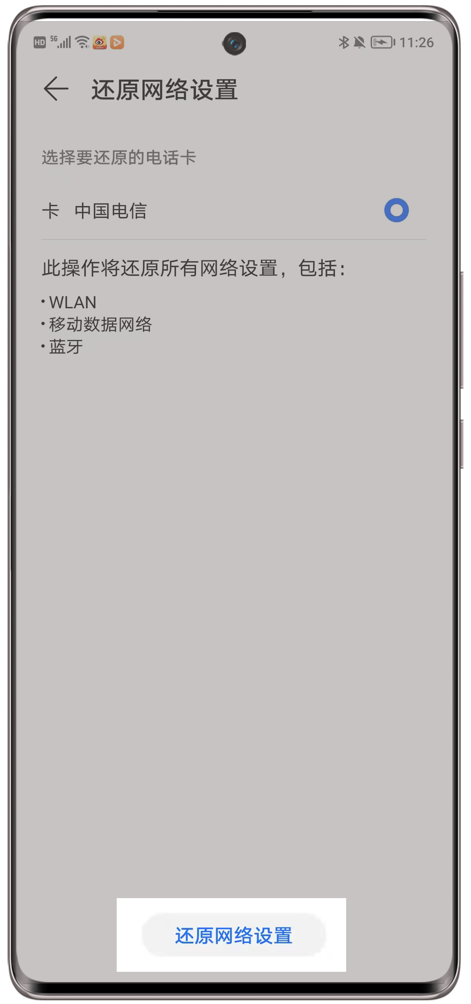 - 升级系统版本或还原网络设置尝试:请您将手机升级至最新版本,如果手机已经是最新版本,建议您在 设置 中搜索并进入还原网络设置,将该SIM卡的网络设置还原。