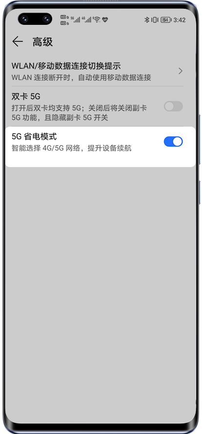 - 是否开启了5G 省电模式:您可以在设置中搜索5G 省电模式并点击进入(如果没有该选项,则暂不支持此功能)。打开5G 省电模式会智能选择4/5G以节省电量,如果您需要一直使用5G网络,您可以关闭此模式。