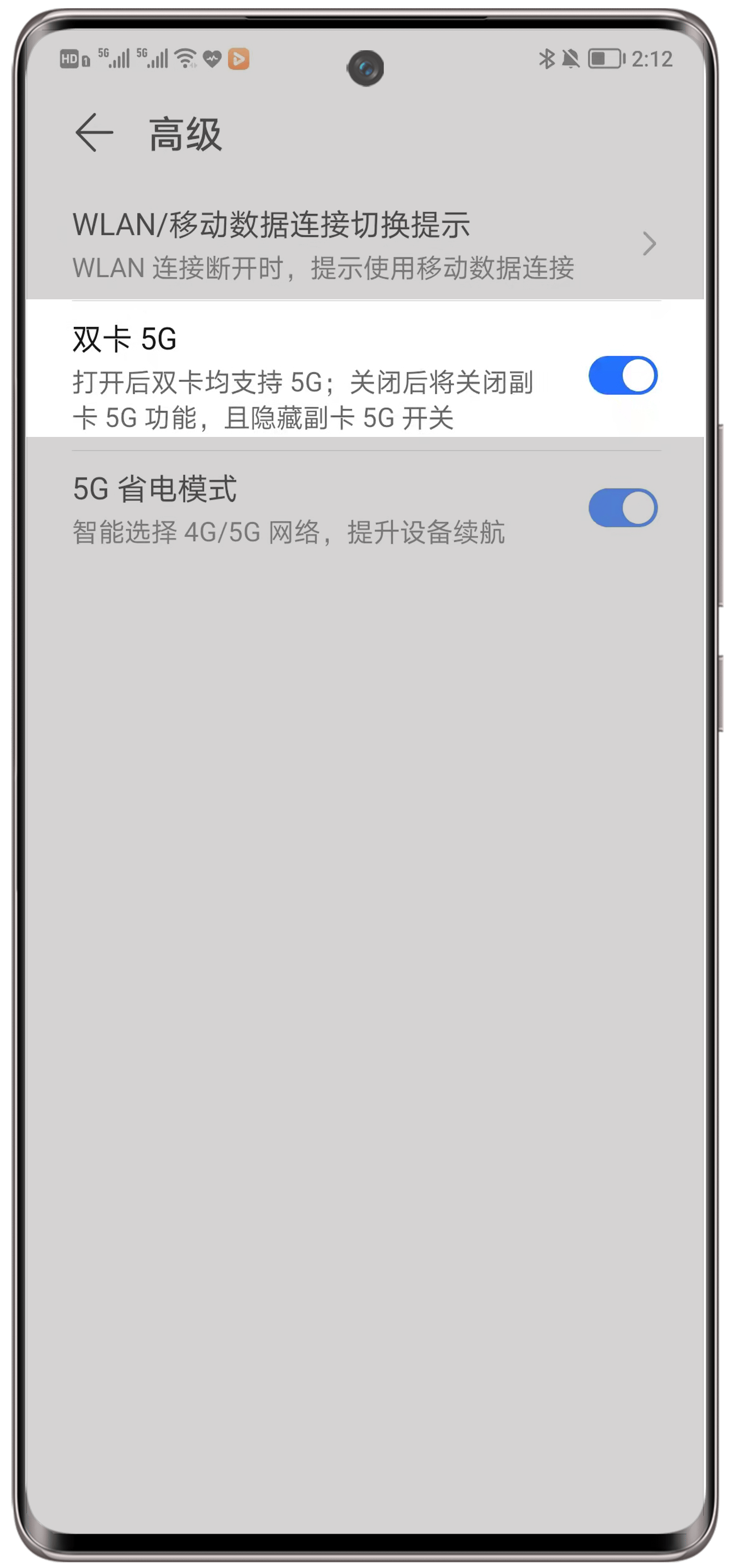 - 若您的手机支持双卡5G:请检查双卡5G开关是否开启,若未打开此开关,则副卡不显示5G。打开方式: