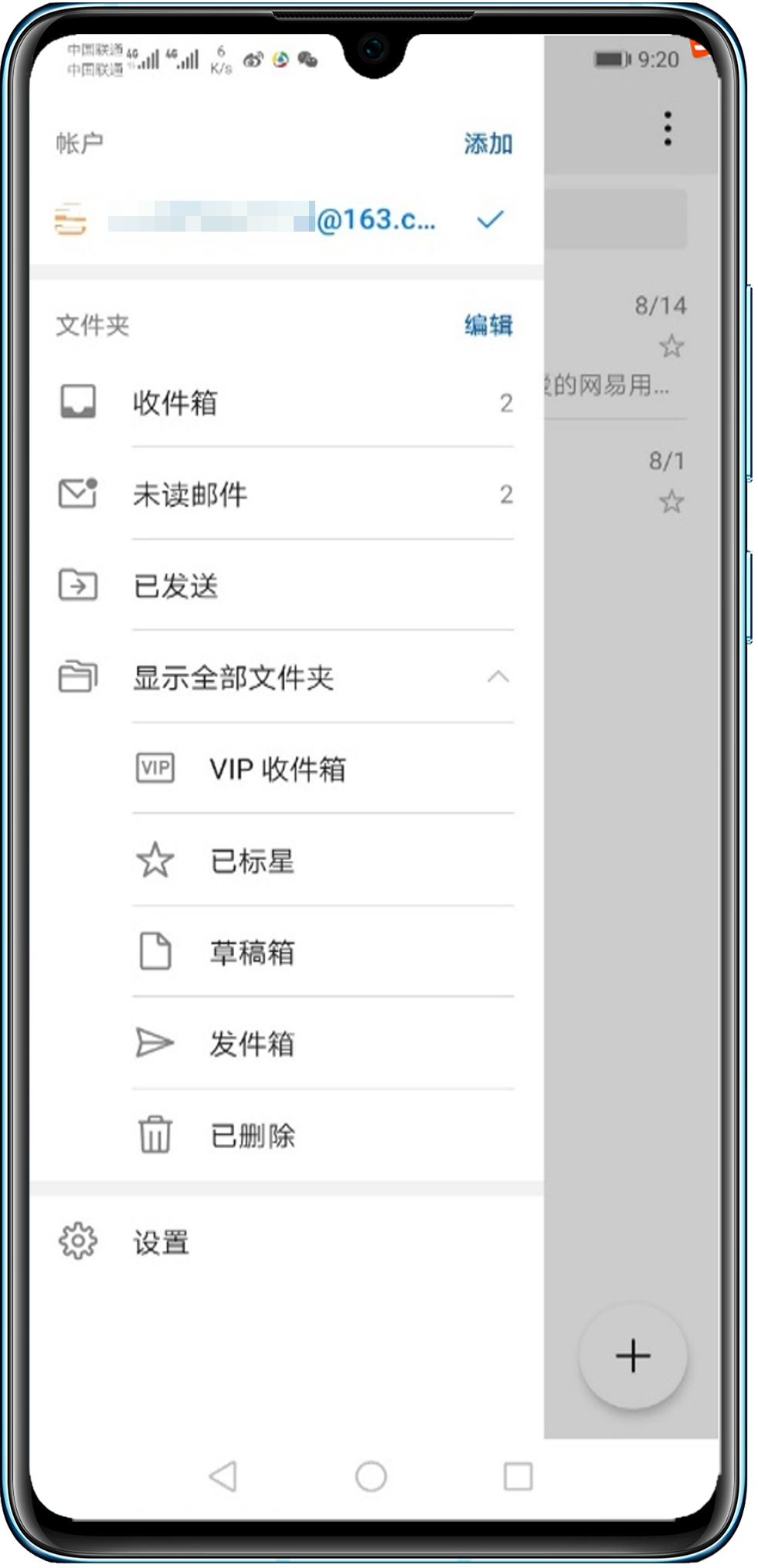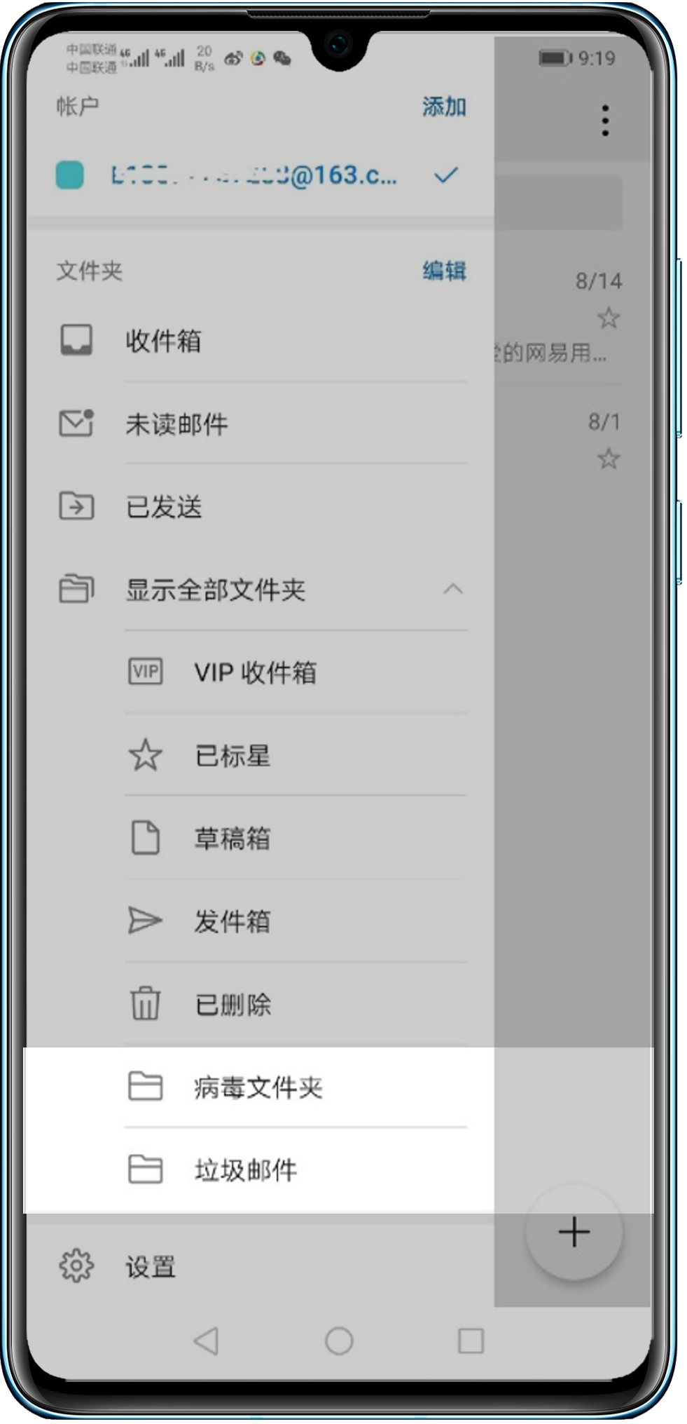 两台设备登录同一账号的电子邮件,电子邮件分类文件夹显示不一致,如下图: