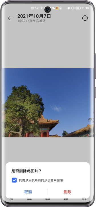 您可以在图库中删除图片/视频时,若出现“同时从云及所有同步设备中删除”复选框时,先勾选该复选框后进行删除,方可同时删除云端中该图片/视频。
