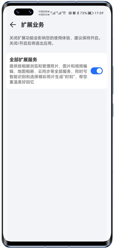 关闭图库的扩展业务后,只能浏览图片和播放视频,无法进行删除、编辑、分享、搜索操作,并且没有相册、时刻、创作的选项卡。点击图库> 设置 > 扩展业务 ,打开“全部扩展服务”开关。