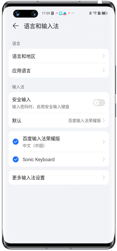 - 确保手机安装并启用了两个及以上的输入法:进入设置>系统/系统或更新>语言和输入法,勾选已下载的输入法。