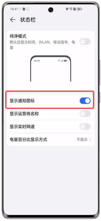 - 进入设置>通知和状态栏>状态栏,开启显示通知图标开关。