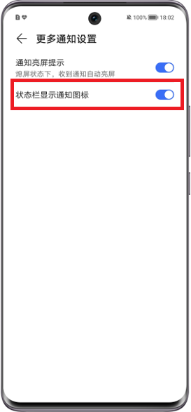 - 进入设置>通知>更多通知设置中,开启状态栏显示通知图标开关。