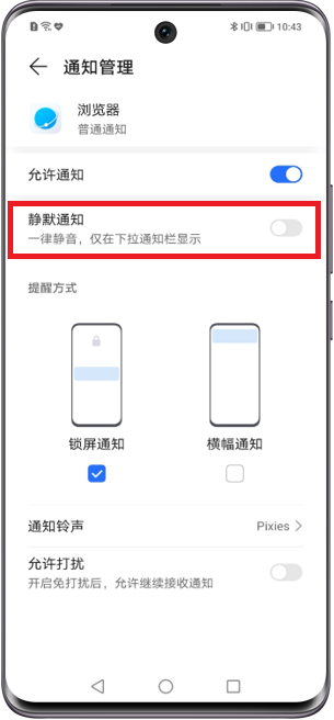 在设置>通知/通知和状态栏,搜索该应用并点击进入通知管理界面,将应用中静默通知开关关闭即可(部分应用无静默通知选项,可跳过)。