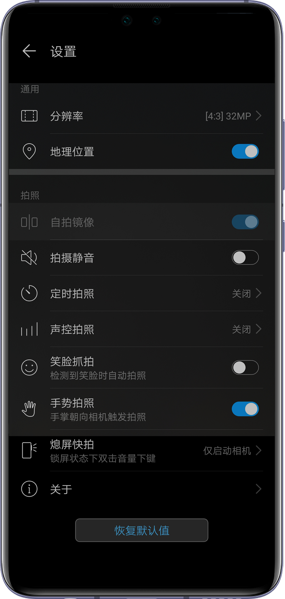 若您不想使用自拍镜像功能,建议在普通拍照模式下,关闭自拍镜像模式进行自拍,然后进入图库找到拍摄好的照片,点击编辑添加水印即可。