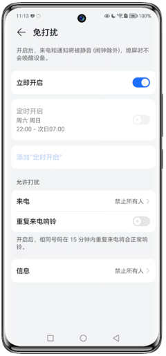 开启免打扰功能后,将来电设置为禁止所有人,同时关闭重复来电响铃开关后,再设置来电或通知铃声时,铃声不会响。