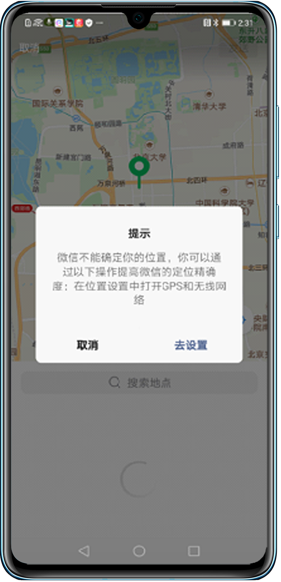 关闭位置信息(或GPS)开关,微信发送位置提示“微信不能确定你的位置”。