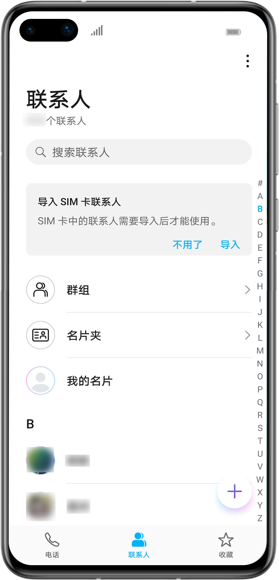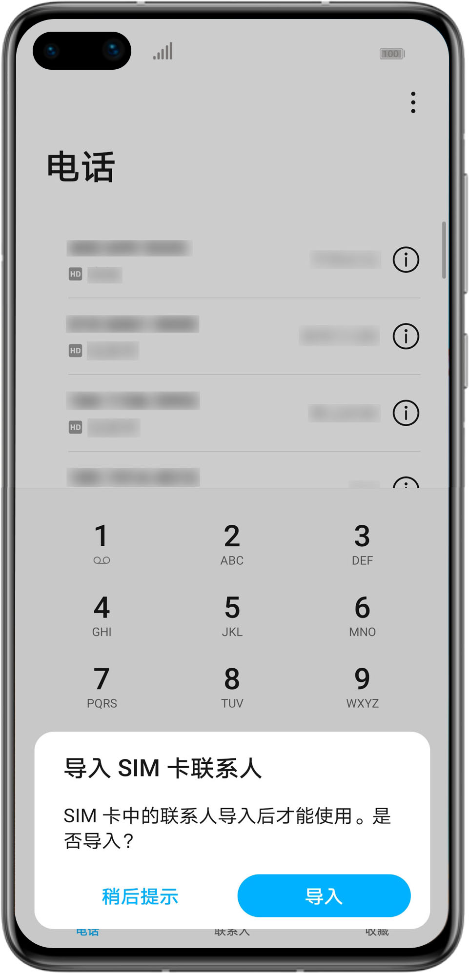 若您选择稍后提示,弹框消失后在联系人列表上方会出现“导入SIM卡联系人”的提示(如下图)。