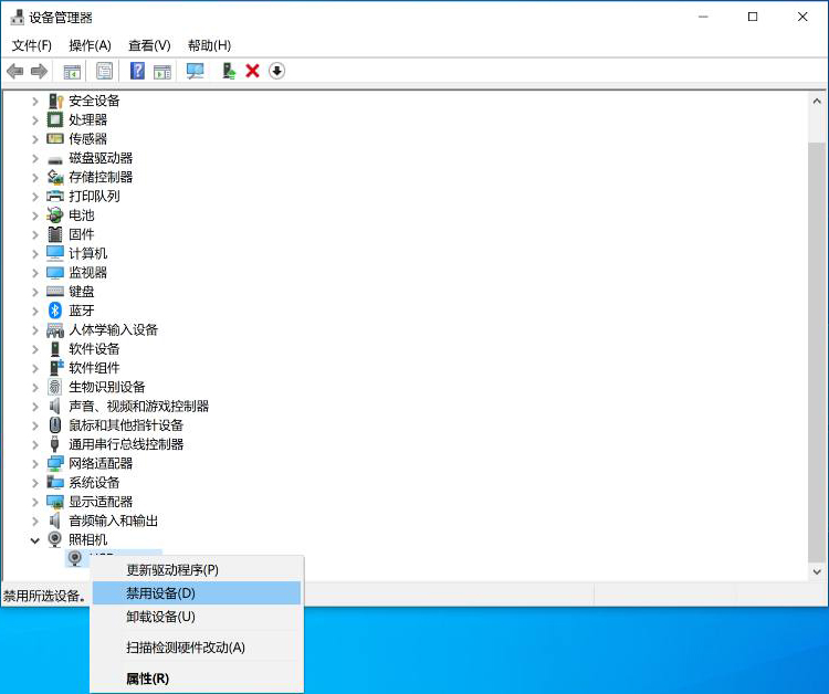 在“设备管理器”中找到“照相机”,展开所有设备,右键单击计算机自带的摄像头,选择“禁用设备”。