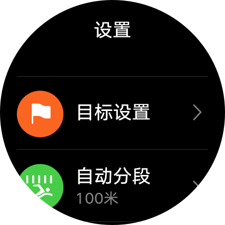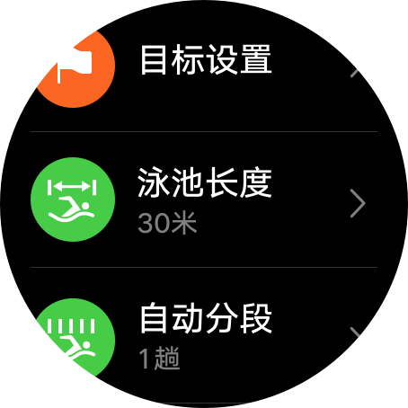 泳池游泳的设置选项:目标设置、长度设置、自动分段。