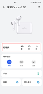 耳机与荣耀手机/平板连接荣耀智慧空间APP/智慧生活APP后,荣耀智慧空间APP/智慧生活APP中的耳机详情界面可查看耳机及耳机盒的百分比电量。