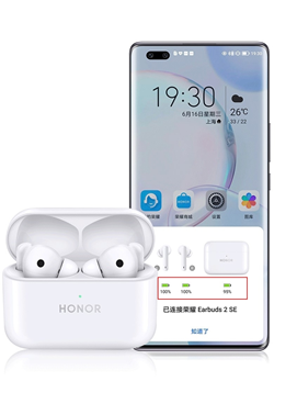 荣耀耳机与荣耀手机/平板(系统版本在MagicUI4.0及以上)连接成功后,弹窗上会显示耳机及耳机盒的百分比电量。