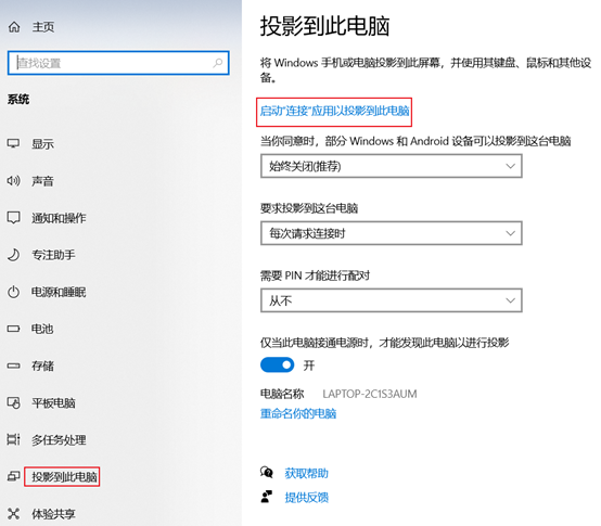 点击 Windows 图标 > 设置图标,选择系统,点击投影到此电脑>点击启动连接应用以投影到此电脑。