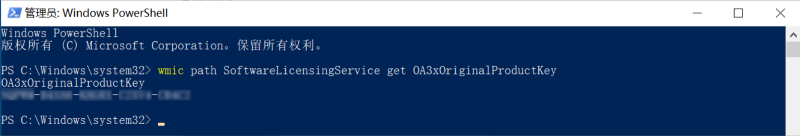 - 输入:wmic path SoftwareLicensingService get OA3xOriginalProductKey,看到格式为XXXXX-XXXXX-XXXXX-XXXXX-XXXXX的产品密钥。