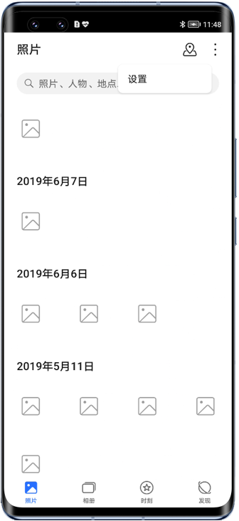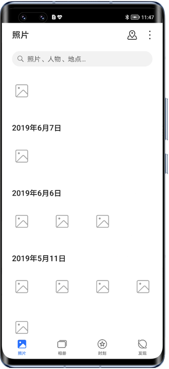 手机/平板显示云端图片/视频时,尚未下载缩略图至本地的云端图片/视频会在图库中暂时显示占位白块,点击跳转至大图界面也会因为缺少缩略图暂时无法正常显示。