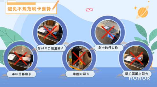 - 刷卡时请您确认手机NFC刷卡区域已对准闸机刷卡区域,手机NFC刷卡区域可以通过荣耀手机NFC刷卡区域查看。