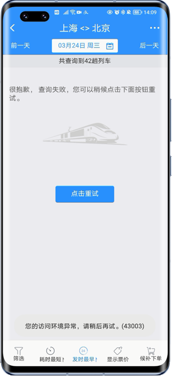 铁路12306提示“您的访问环境异常,请稍后再试。(43003)”。