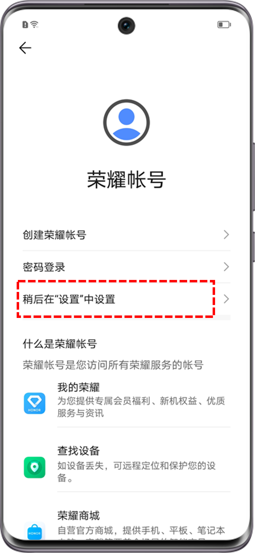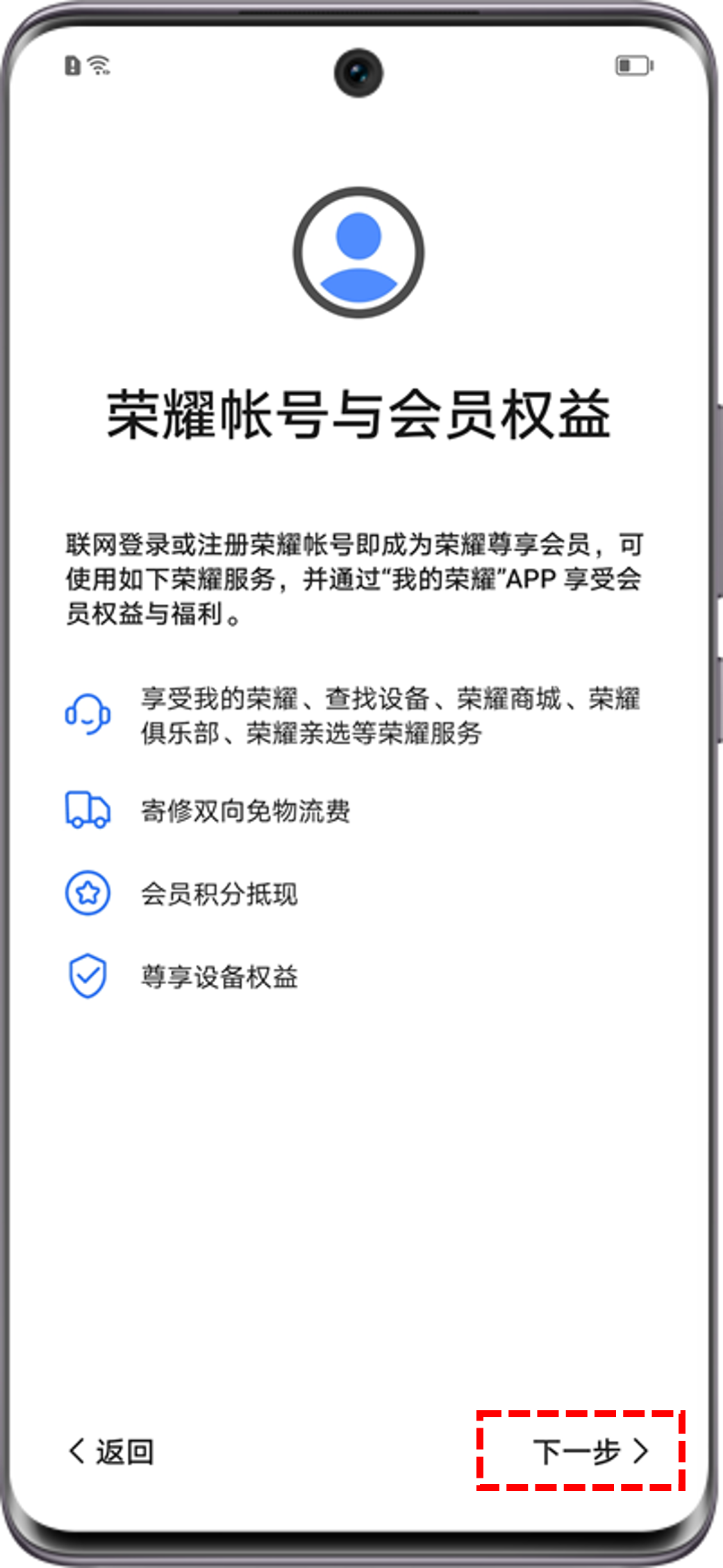 在荣耀账号与会员权益页面,点击下一步 > 没有账号或其他登录方式 > 稍后在“设置”中设置 > 不使用,即可跳过。