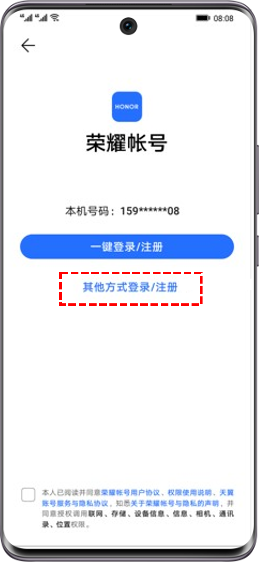 在荣耀账号与会员权益页面,点击下一步 > 其他方式登录/注册 > 没有账号或其他登录方式 > 稍后在“设置”中设置 > 不使用,即可跳过。