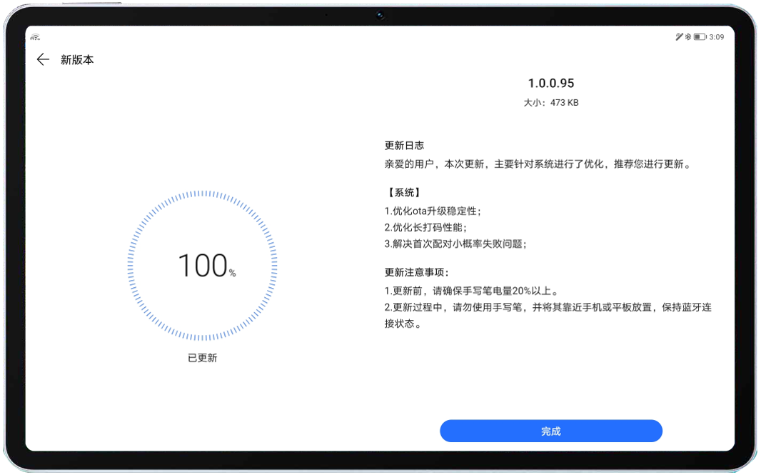 - 在升级过程中,请按升级界面提示语来操作:更新期间,请不要使用手写笔,并将其靠近平板放置,保持连接状态。