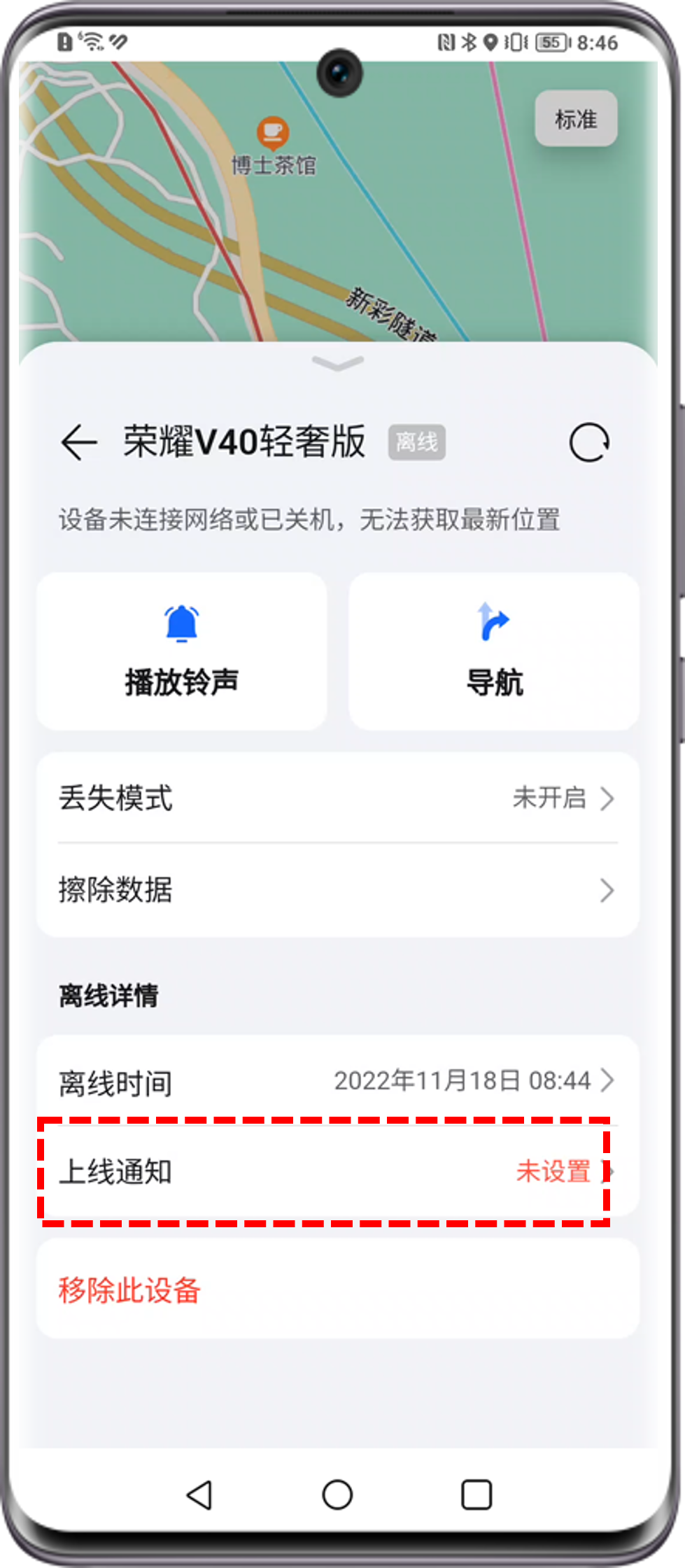 当丢失设备的远程连接网络功能处于开启状态时,如您通过查找设备功能定位该设备,但因该设备未联网而无法定位时,查找设备功能将远程自动发起联网指令,尝试重新开启离线设备的移动网络开关,帮助您定位查找。