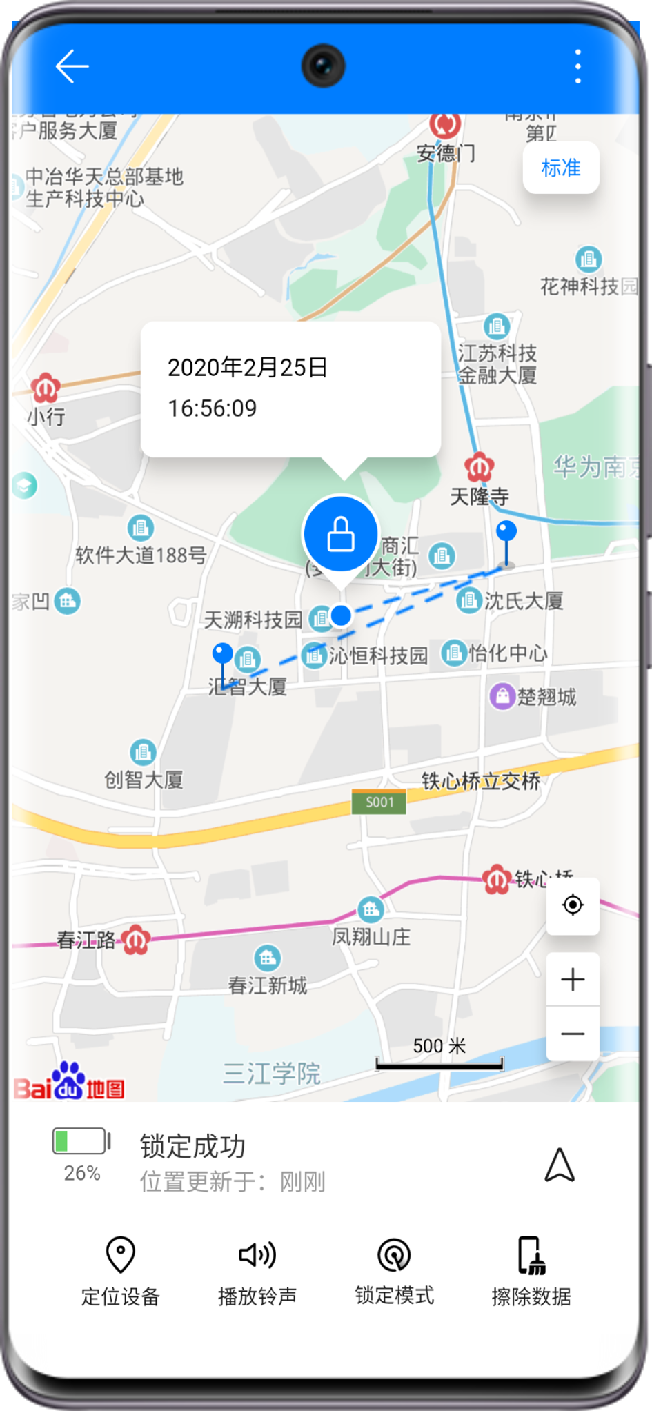 3.丢失模式设置成功后,若丢失设备一直处于满足已登录荣耀账号、开启查找设备、开机及联网条件的状态,丢失设备的位置将被持续追踪,并在地图上显示近24小时的运动轨迹。但若您一直主动定位,则不会生成轨迹。