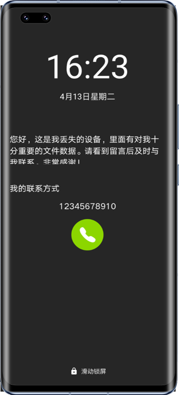 2. 丢失模式设置成功后,丢失设备仅可拨打屏幕上预留的手机号码,但可以接听所有来电。