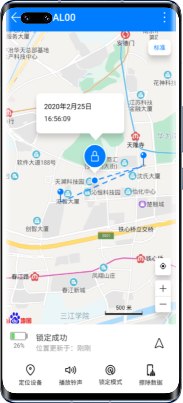 如下图,蓝色坐标戳为丢失设备后设备移动的运动轨迹,水滴状蓝色(含有锁定标志)点为最新定位位置,中间蓝色虚线为两者之间的直线距离。