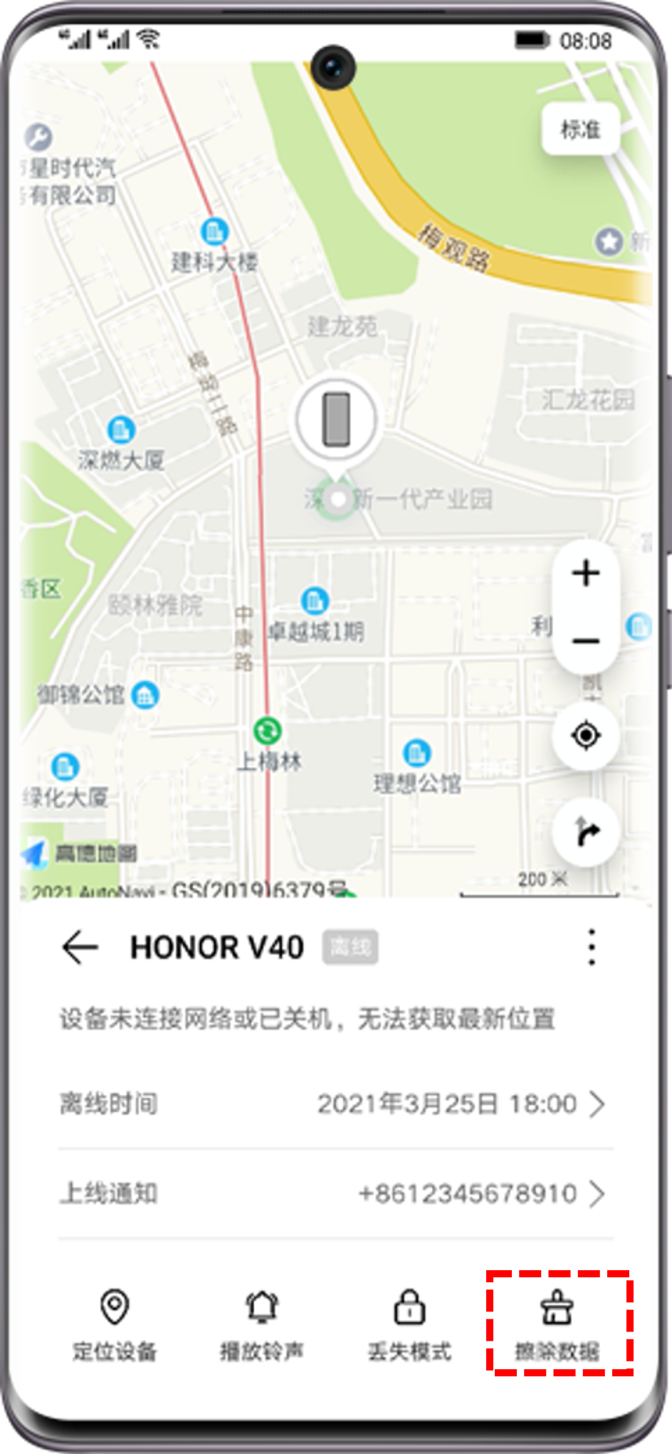 1.在查找设备APP点击“擦除数据”后即可擦除设备中的所有数据。