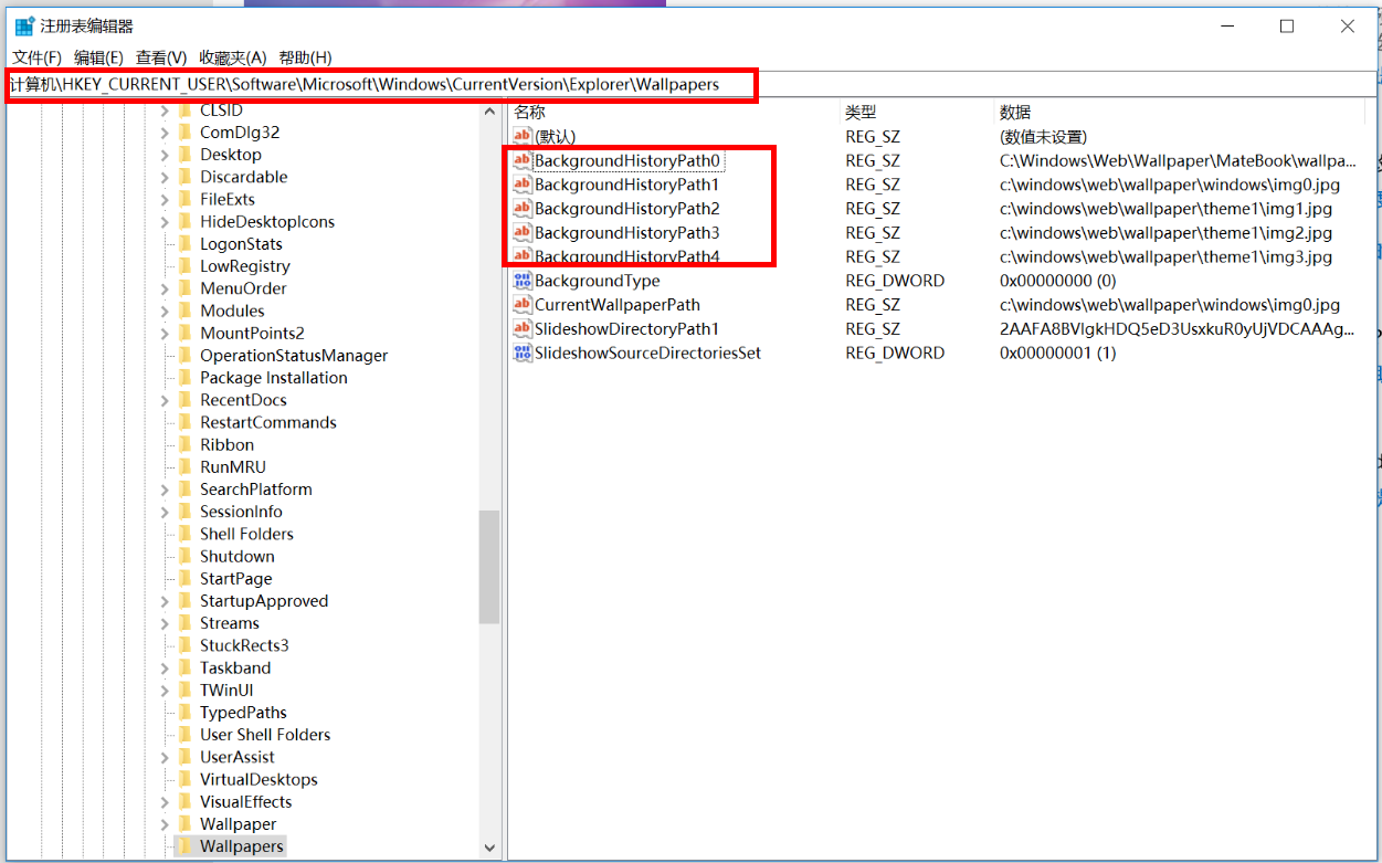 - 在打开的“注册表编辑器”中,定位到HKEY_CURRENT_USER\Software\Microsoft\Windows\CurrentVersion\Explorer\Wallpapers。在右侧窗口中可以显示所有的历史桌面背景,按照 0-4 排列。