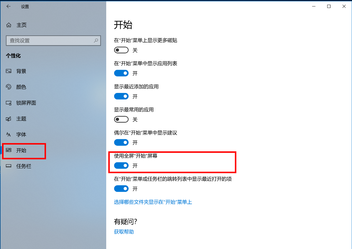 点击“开始”,开启“使用全屏“开始”屏幕”,开始菜单将全屏显示。关闭“使用全屏“开始”屏幕”,开始菜单将恢复到小窗口模式。