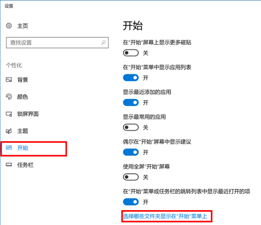 点击“开始 > 选择哪些文件夹显示在“开始”菜单上” 。