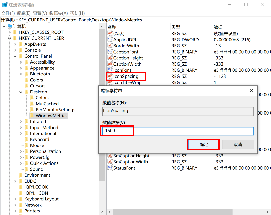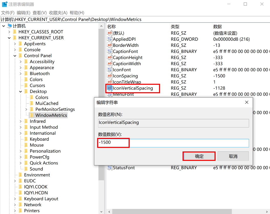 如果要修改为100像素,双击“IconSpacing”,在弹出的对话框中把“数值数据”修改为-1500。点击“确定”。