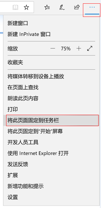 打开 Microsoft Edge 浏览器,访问您喜爱的网站,然后选择设置图标,点击 “将此页面固定到任务栏”。