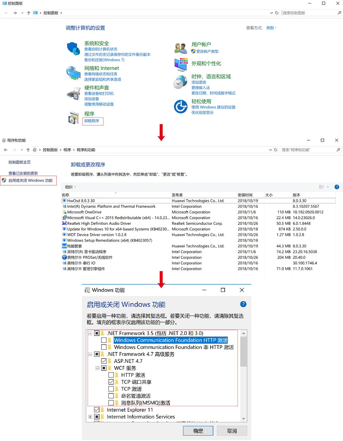 - 点击“卸载程序 > 启用或关闭 Windows 功能”。在“Windows 功能”窗口中勾选 .NET Framework 相关的选项,然后点击“确定”。