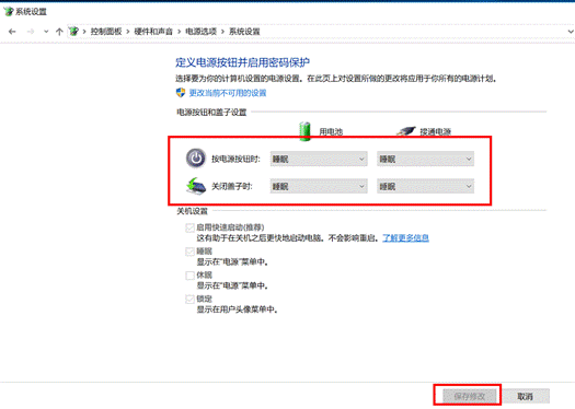 在“电源按钮和盖子设置”中选择计算机“按电源按钮时”或“关闭盖子时”的状态,设置后,点击“保存修改”。