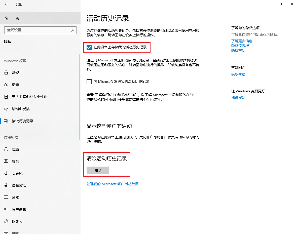 此操作仅能清除本地帐户的活动历史记录。登录微软帐户会导致隐私记录同步至本地帐户,本地会出现无法删除的情况,可以在微软官网进行清理。