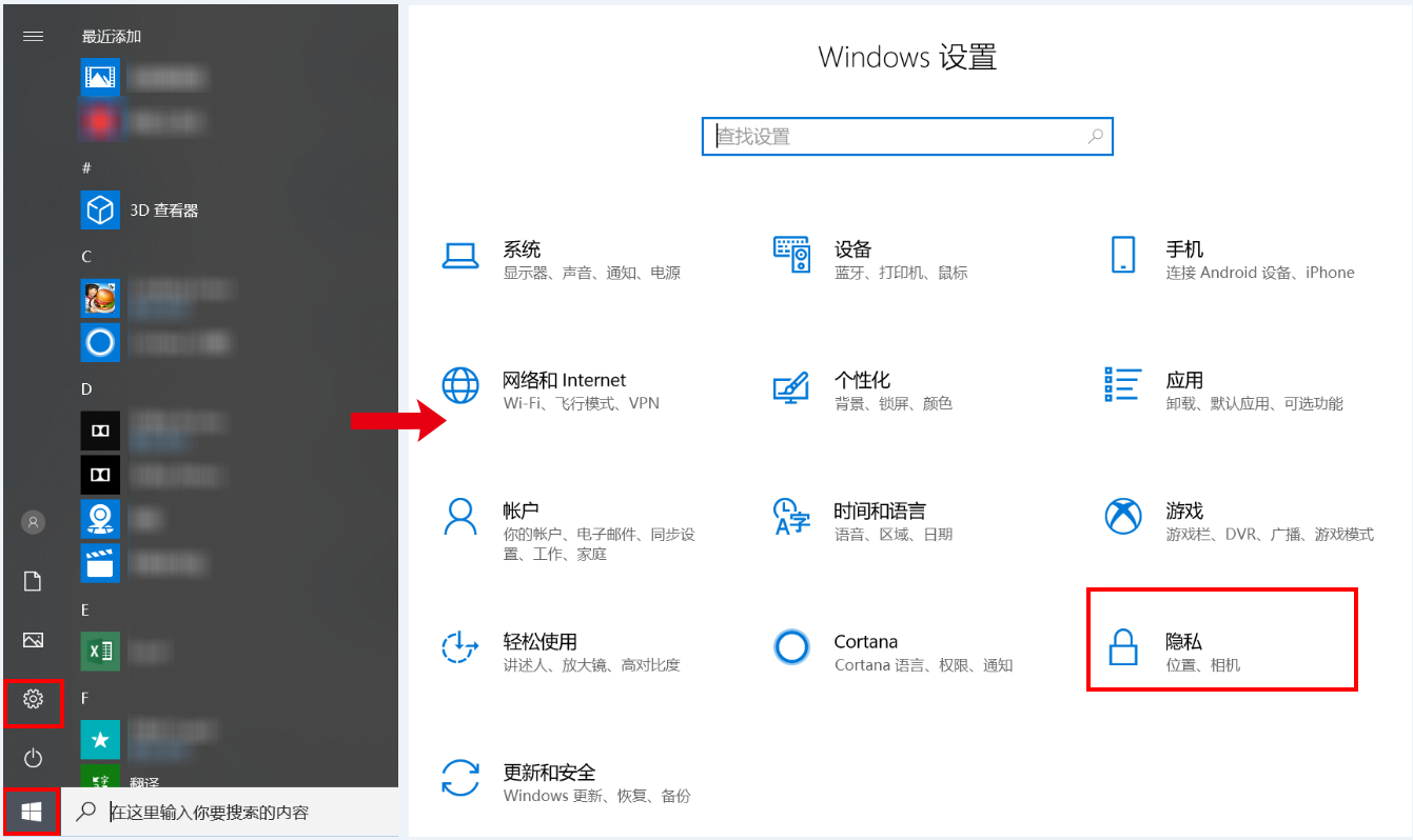 - 点击 Windows 图标 > 设置图标,选择“隐私”。