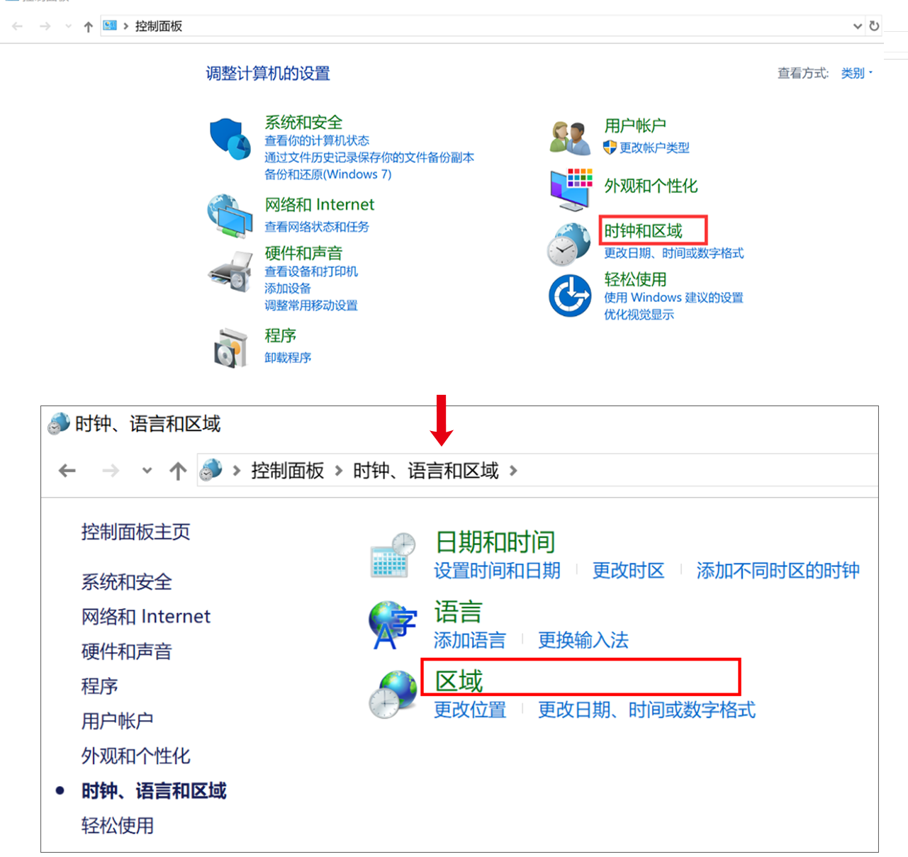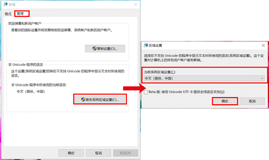 在“区域”窗口中选择“管理”选项卡,点击“更改系统区域设置”,在“当前系统区域设置”下拉列表中选择当前系统区域设置,点击“确定”后重启计算机以完成更改。