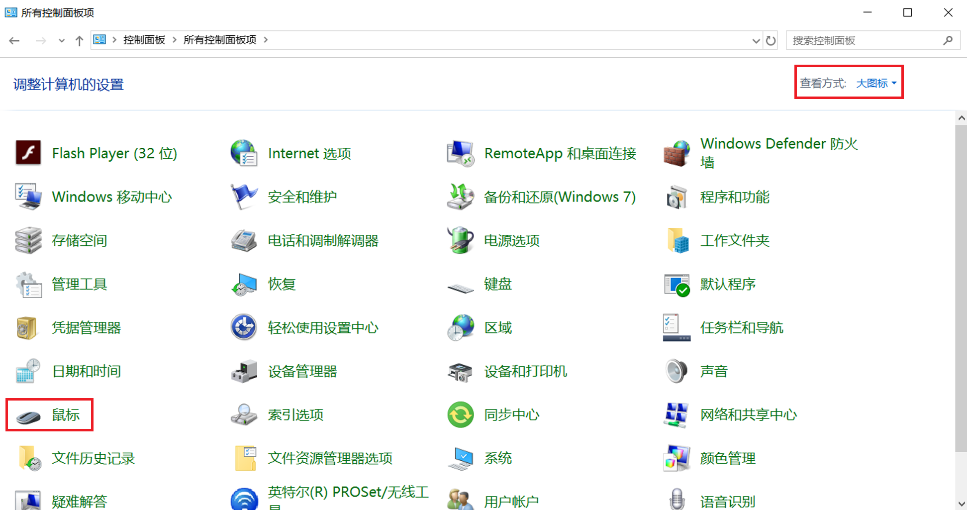 将查看方式改为“大图标”,然后点击“鼠标”。