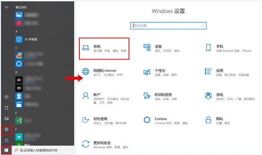 点击桌面 Windows 图标 > 设置图标,选择“系统”。