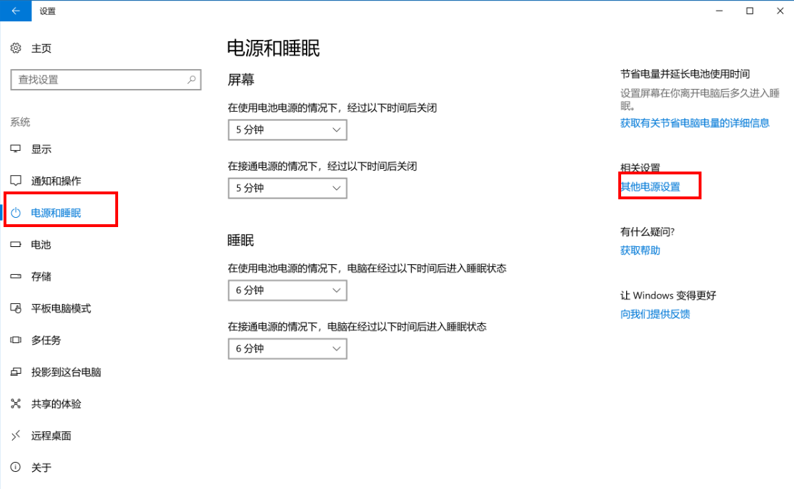 点击“电源和睡眠 > 其他电源设置” 。