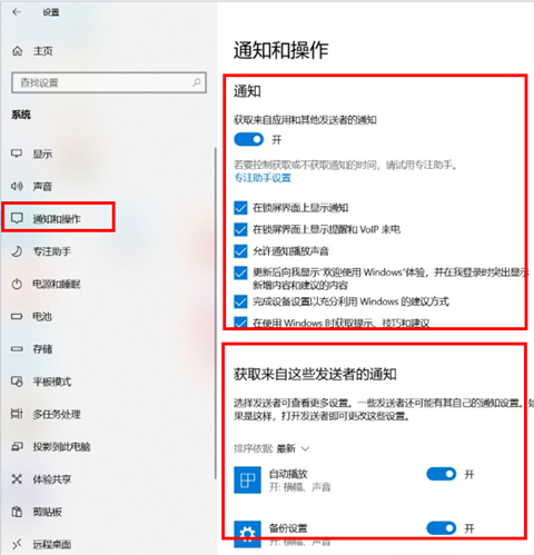 点击“通知和操作”,在界面右侧选择要设置的通知消息。