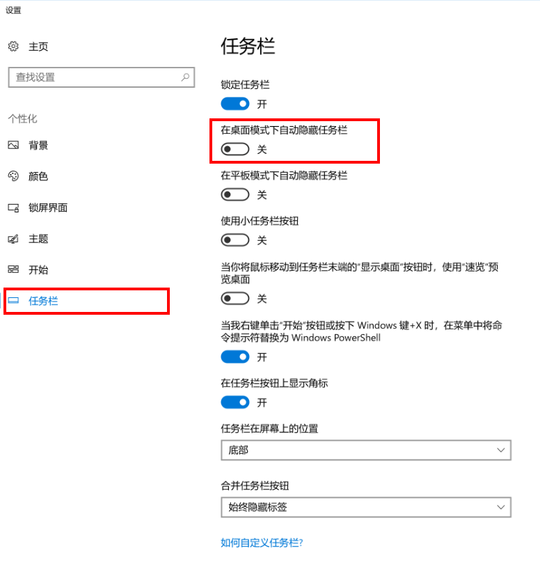 点击 “任务栏”,开启或关闭“在桌面模式下自动隐藏任务栏”开关。